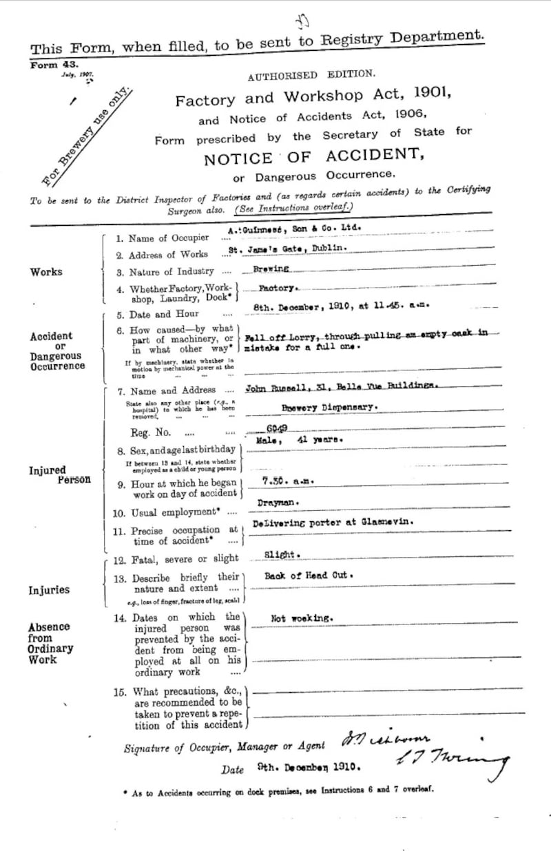 Shortly before noon John Russell, 41 years old, and living in Dublin for six years after moving up from Cork, was in Glasnevin, dropping off barrels of porter, when he tumbled backwards off the Guinness cart and cut his head.