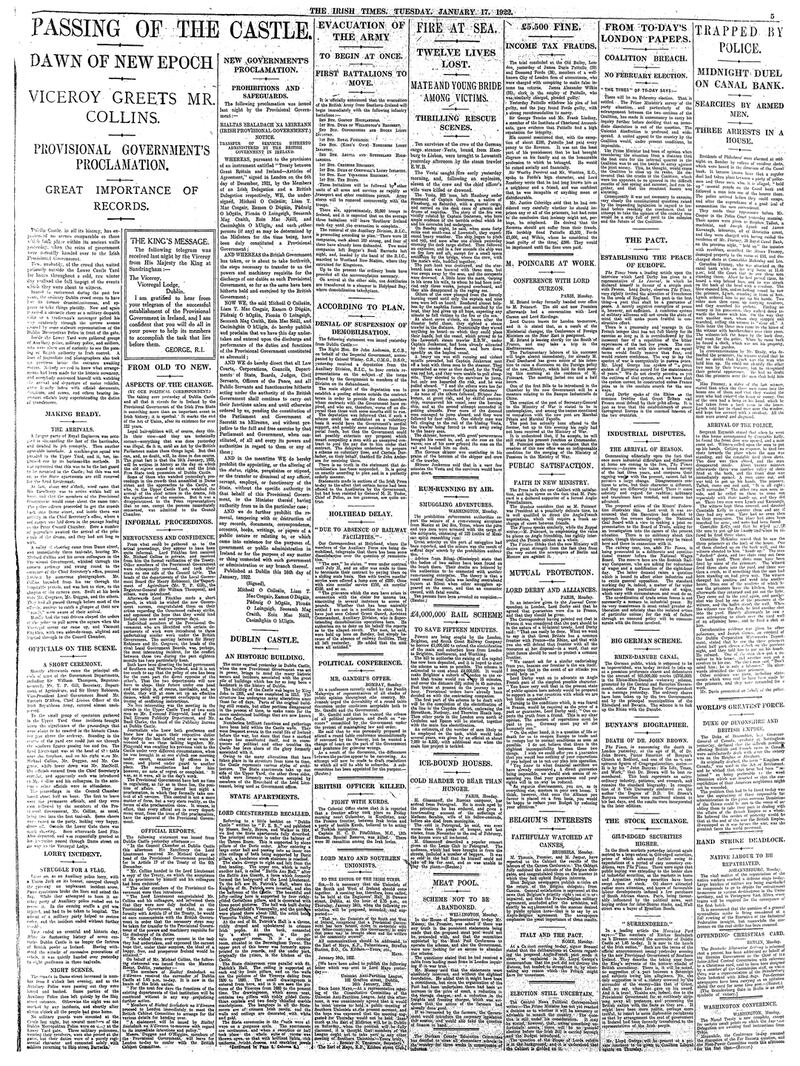 The taking over yesterday of Dublin Castle and all that it stands for in Ireland by the Provisional Government of the Irish Free State is something more than an important event in Irish history; it is epochal. It marks the end of the Act of Union after its existence for over 122 years.