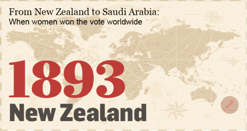 New Zealand: First nation to grant female suffrage, in 1893, to all adult women.