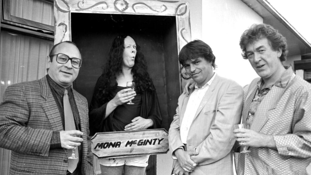 The picture was taken at a reception at the Gresham Hotel in September 1986 to mark the premiere of the film Mona Lisa. You will, no doubt, have spotted Bob Hoskins – star of the film – on the left in the check jacket, with director Neil Jordan in the middle and Vinnie McCabe, who according to the caption was then chairperson of the Centre of the Performing Arts, on the right. This experienced trio must have known, surely, that if they posed for a picture in front of a fake frame bearing the inscription "Mona McGinty" and containing the personage of the mime artist Thom McGinty, something unscripted would almost certainly happen.