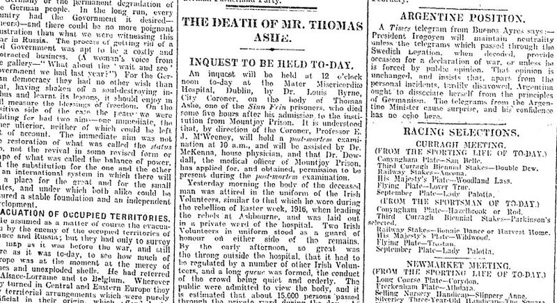 An inquest will be held at 12 o'clock noon today at the Mater Hospital Dublin by Dr Louis Byrne, city coroner, on the body of Thomas Ashe, one of the Sinn Féin prisoners who died some five hours after his admission to the institution from Mountjoy Prison.