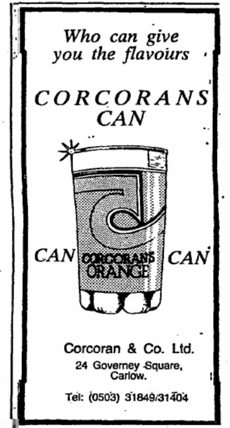 Tucked in the corner is the little can that could, an ad for Corcoran's fizzy orange. Corcoran's of Carlow made several products, including Castle Lemonade, Castle Cola, and the Carlo Orange brand. Soft drinks and mineral water manufacturing and bottling was a solid business in Carlow for generations. Thomas Corcoran opened a mineral water factory in Carlow in 1827, using natural water from a well next to Carlow Castle. Red lemonade is an Irish curiosity, but even more so was Corcoran's brown lemonade. Corcoran's was indeed a behemoth in regional Irish soft drinks, although McDaid's Football Special stands out in the class of curious Irish minerals - which includes Cidona, TK red lemonade, Tanora - as one of the most unique, originally made in Ramelton in Donegal. McDaid's banana flavour is also popular.