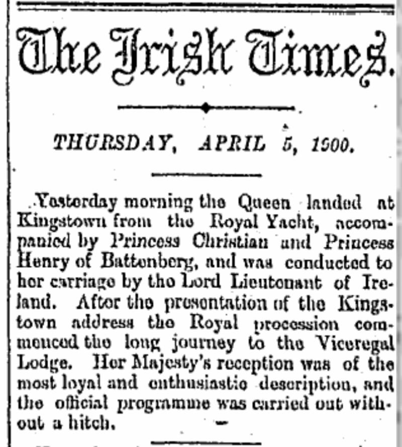 While the reporting style in the newspaper was relatively reserved at the time, all of that went out the window when the queen came to town. The lead report on Thursday, April 5th, was gushing, beginning: "The scene which Dublin presented yesterday will live long in the memory of those who witnessed it. In her long and glorious reign Her Majesty the Queen-Empress has been the recipient of many popular ovations which from a purely spectacular point of view might perhaps have eclipsed that of yesterday, but we venture to think that for genuine and spontaneous enthusiasm exhibited at every point of her long route from the prosperous and loyal Township from which she started to her destination in the Phoenix Park she has never witnessed a more enthusiastic expression of real affection for her person and attachment to her Throne."