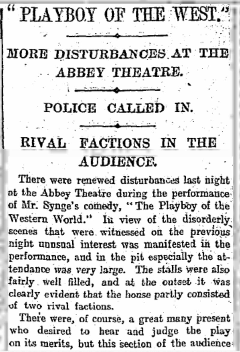 On January 30th, 1907, reports continued in The Irish Times about the ongoing situation at the Abbey Theatre during JM Synge’s The Playboy of the Western World. “There were renewed disturbances last night at the Abbey Theatre during the performance,” the report began, “In view of the disorderly scenes that were witnessed on the previous night unusual interest was manifested in the performance, and in the pit especially the attendance was very large. The stalls were also fairly well filled, and at the outset it was clearly evident that the house partly consisted of two rival factions.”