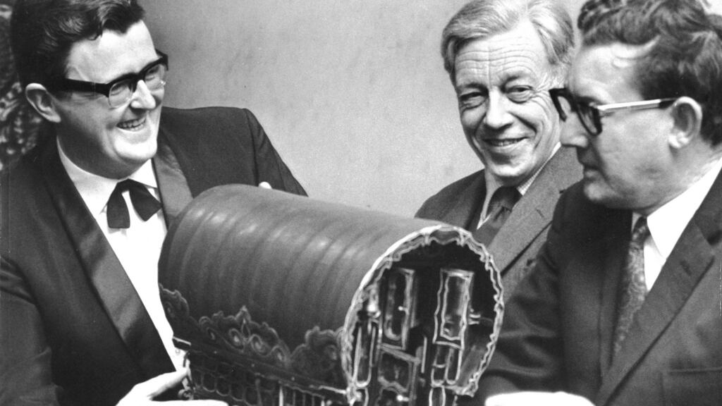 We should also note that the image is attempting to put a positive spin on the situation. The men in the photograph – named as, from left, “Mr Vincent Jones, organiser of the week’s activities, Dr Cecil Day-Lewis, Poet Laureate, and Mr Niall Tobin” – are examining a beautifully detailed model of a caravan which, the caption assures readers, was crafted by a Traveller.