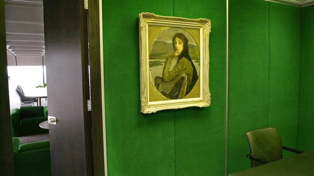 This is not, in fairness, a painted surface but one of those modular fabric-covered walls beloved of business premises. Still, Lady L must be wondering why anybody at the Central Bank thought it would make a suitable background against which to hang her husband’s famous portrait of her as the female personification of Ireland, all kitted out in her best Subtle Sage (or maybe even Lovely Lichen) dress.
