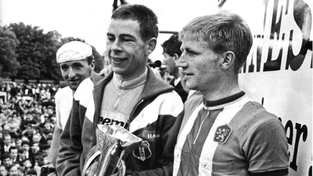 Our photo today, however, shows the most famous of them all, Séamus (Shay) O’Hanlon, picking up the trophy in the Phoenix Park in 1967 after winning it for the fourth time. He is flanked by Pierre Ropert of France (left), the runner-up, and the winner of the final stage, Jim Kennedy (right).