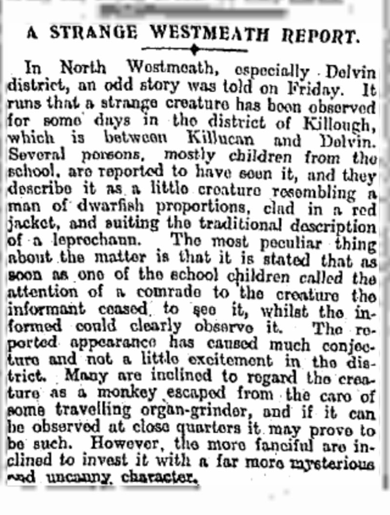 A report in the newspaper on April 20th, 1908, began mysteriously: "In North Westmeath, especially Delvin district, an odd story was told on Friday. It runs that a strange creature has been observed for some days in the district of Killough, which is between Killucan and Delvin. Several persons, mostly children from the school, are reported to have seen it, and they describe it as a little creature resembling a man of dwarfish proportions, clad in a red jacket, and suiting the traditional description of a leprechaun."