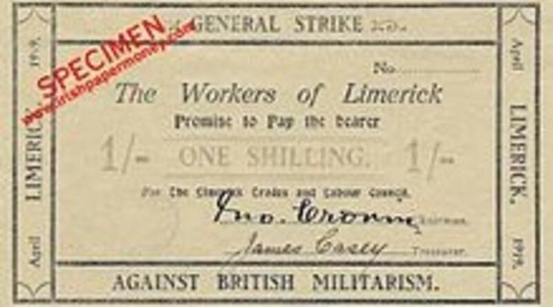 The notes, the size of an ordinary treasury note, had on their border the words: “General Strike against British Militarism 1919.” On the face was printed: “The workers of Limerick promise to pay the bearer the sum of ___ shillings.”