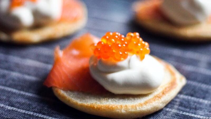 Serve each blini with a layer of smoked salmon and a dollop of crème fraîche topped with your choice of caviar.