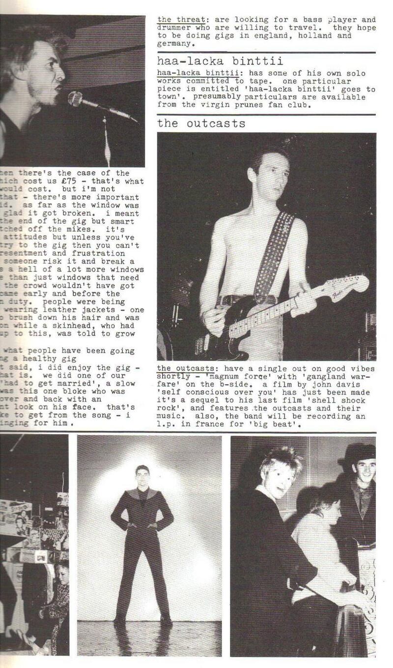 "I despise the hordes of 1977 hippies who 'hang out' at Advance ripoff each weekend [Advance was a record shop run by Fred Talbot on South King Street where you could get some of the records your heart desired]. Everyone is similar. Anarchy on the back but not in the head. They despise arrogance and elitism – so they should – tribes have no place in 1980. I am arrogant and elitist because I'm better than them and I know it." (From Vox, issue 3)