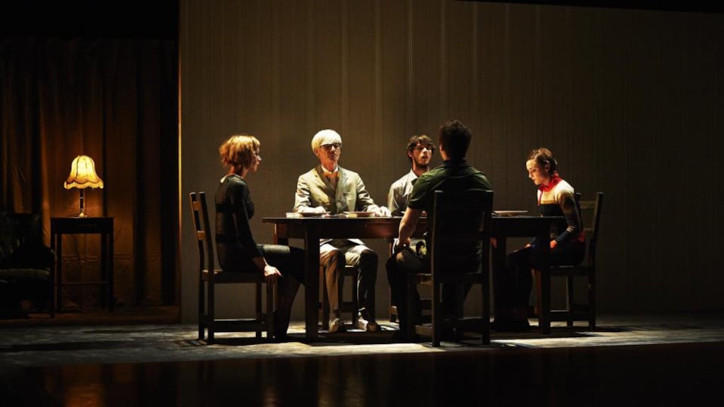 The characters gather too around a wooden table, a communal moment of remembered house parties. The final visual is of that same table now laid for formal dinner, the figures shedding their darker selves to dine together, accompanied by the Grey Man, part puppeteer and projectionist.