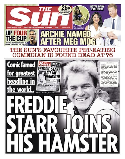 And the Sun put him back on its front page. Noting that the comedian was “famed for the greatest headline in the world”, the paper’s Friday front-page headline reads “Freddie Starr joins his hamster”. – Additional reporting: PA
