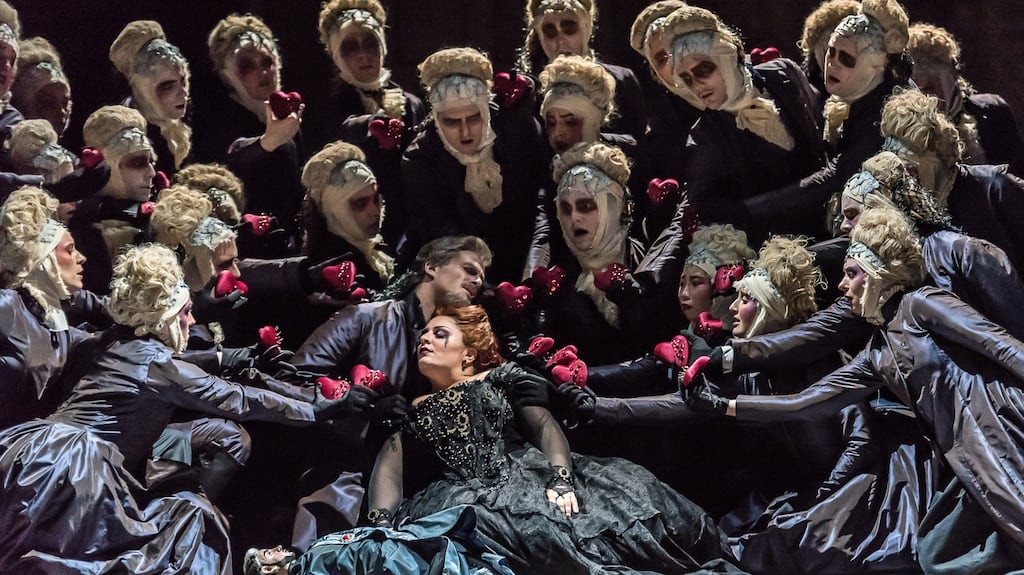 The Wexford Festival’s intricate, handsome-looking production, directed by Fabio Ceresa, with sets by Gary McCann and costumes by Giuseppe Palella, presents the action in a giant doll’s house that fully fills the stage, but which can also separate into modules that revolve, separating and reassembling into new structures.