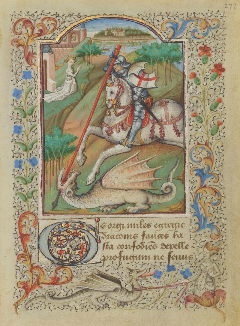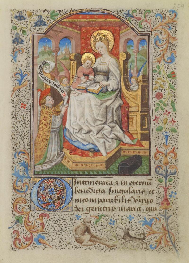 Apart from the miniatures, the decorative borders are dense floral scrolls populated, on closer inspection, by an extensive cast of human, animal and supernatural characters, knights and ladies, apes and lions, numerous birds, jesters and musicians, mermaids and dragons. There are no repeat-pattern shortcuts, the artisans’ touch enlivens what could easily be repetitive and dull.