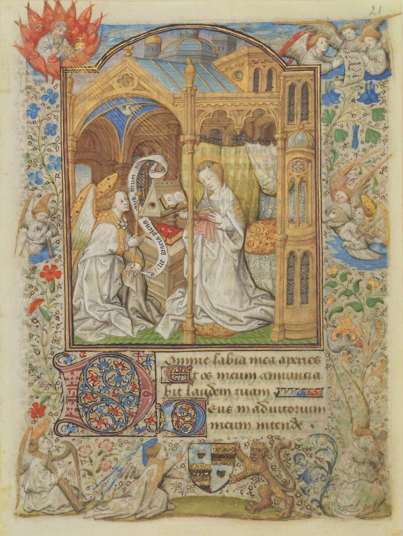 Each hour is marked by a miniature depicting an episode in the life of the Virgin alternating, in the case of The Coëtivy Hours, with the Hours of the Holy Cross (episodes from the Passion), and the Hours of the Holy Spirit, indicating the role of the Holy Spirit in the redemption of humanity.