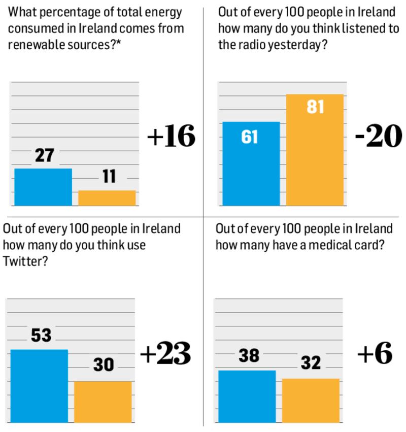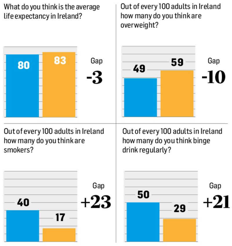 When asked what proportion of Irish people rate their health as good or very good, those surveyed guess 60 per cent, while the reality is 84 per cent.