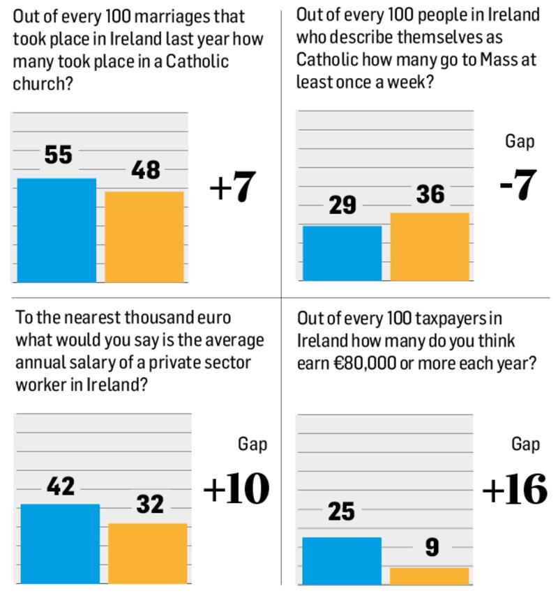 Irish people also reckon other people are older, slimmer and richer than they actually are, and the survey suggests we also have a skewed understanding of the disparities between public and private sector wages.