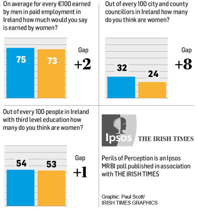 One area where there is a lower gap between the perception and the reality is the gender divide. When asked how much of every €100 men earn do women earn, the perception was €74.70 compared with a reality of €73. When asked how many out of every 100 graduates in Ireland are women, people guessed 53.6 per cent on average – which was almost exactly right. The correct figure is 53 per cent.