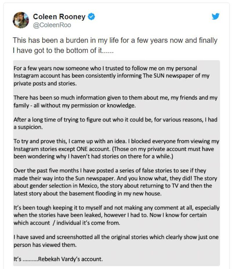 If, by some mystery of circumstance you managed to avoid the genesis of said event, the gist is this: Colleen Rooney, noted WAG (an acronym for the 'wives and girlfriends' of famous footballers) had noticed stories about her were being leaked to the press, so set up a sting whereby she would seed fake stories to various people and see which were passed on. By so doing she deduced that fellow WAG Rebekah Vardy was the culprit, and laid her conclusions bare in a post so dripping with tension and drama it could have been scored by Hans Zimmer.