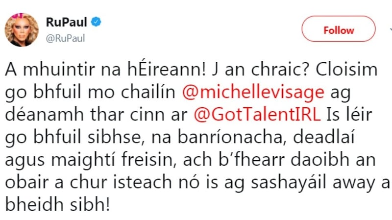 Drag queen RuPaul has called "a mhuintir na hÉireann" "deadlaí agus maightí" in a tweet – in Irish – to show her support for Michelle Visage, one of the judges on Ireland's Got Talent. RuPaul, host of RuPaul's Drag Race: All Stars, warned that we had better work hard or we would be "ag sashayáil away".