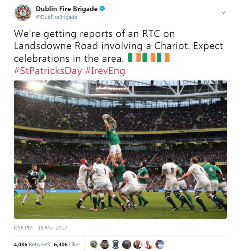 But Twitter wasn't completely devoid of hope for the future of humanity. One of the year's top Irish tweets was by Inpho photographer Morgan Treacy, as he caught a moment between Galway manager Micheál Donoghue and his father Miko that would melt Arctic glaciers. Also Full marks also to Dublin Fire Brigade for relevance, wit and national pride for their tweet celebrating the Irish rugby victory against England on March 18th.