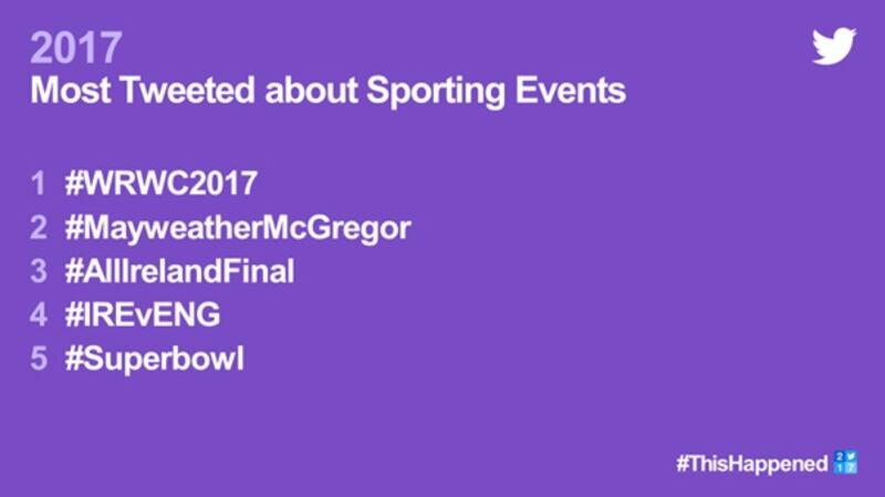 Other sporting moments that caught the imagination of Twitter included #WRWC2017, #mayweathermcgregor, #AllIrelandFinal, #IREVENG and #Superbowl.