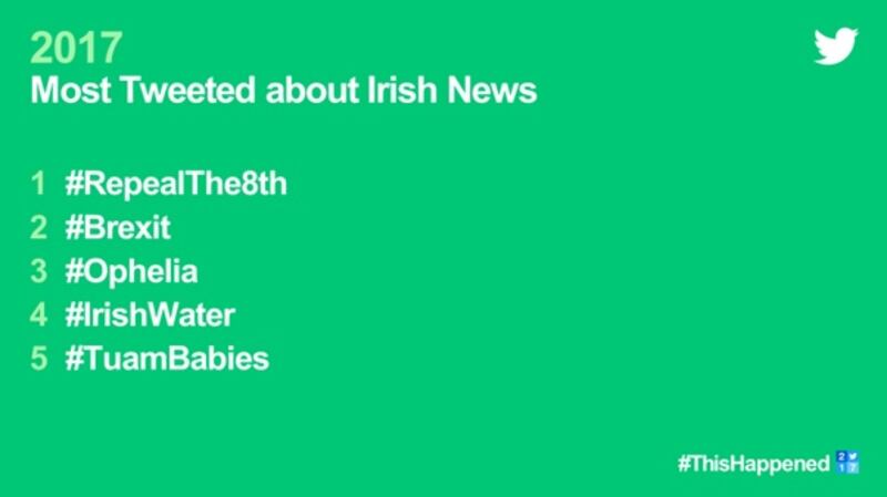 #RepealThe8th is in at number one this year in the list of the top five Irish news hashtags, up one place on 2016, reflecting the movement’s continued momentum on social media. A handful of related hashtags, including #KnowYourRepealers and #trustwomen also gained prominence this year.