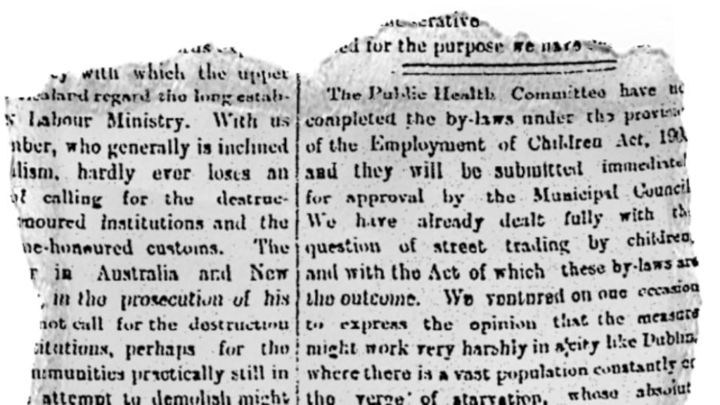 The Public Health Committee have now completed the by-laws under the provision of the Employment of Children Act, 1903, and they will be submitted immediately for approval by the Municipal Council. We have already dealt fully with the question of street trading by children, and with the Act of which these by-laws are the outcome. We ventured on one occasion to express the opinion that the measure might work very harshly in a city like Dublin, where there is a vast population constantly on the verge of starvation, whose absolute needs must in part be supplied by the children.