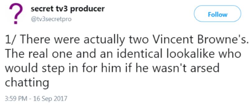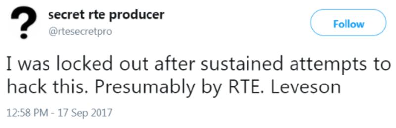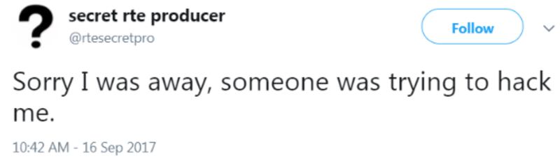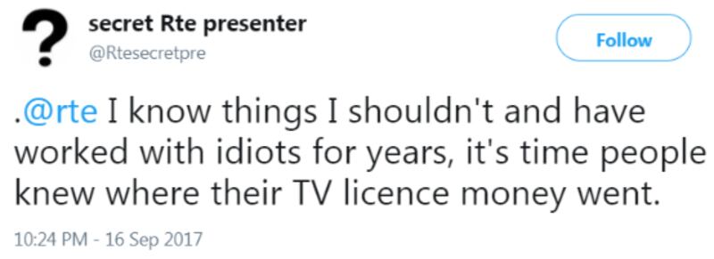 It was high time Ireland got one of its own. Step forward (actually, perhaps best that you do NOT step forward) @rtesecretpro, a Twitter account started on September 7th, by someone describing themselves as a "Secret RTÉ producer" who had "worked in, or in conjunction with a lot of different areas. Primarily TV. Kids, Daytime & Lifestyle, Entertainment, Docs, comedy and a little radio."