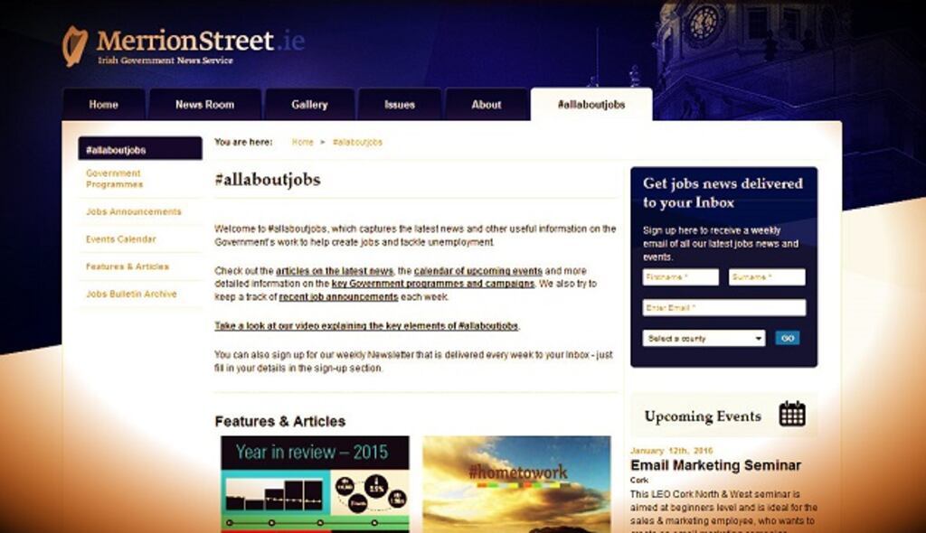 Government hub updated with the latest job and funding announcements, events, and other news. Jobseekers can sign up for a weekly email to notify them of certain vacancies in both the public and private sector. Follow them on Twitter @allaboutjobsIE. merrionstreet.ie/en/allaboutjobs