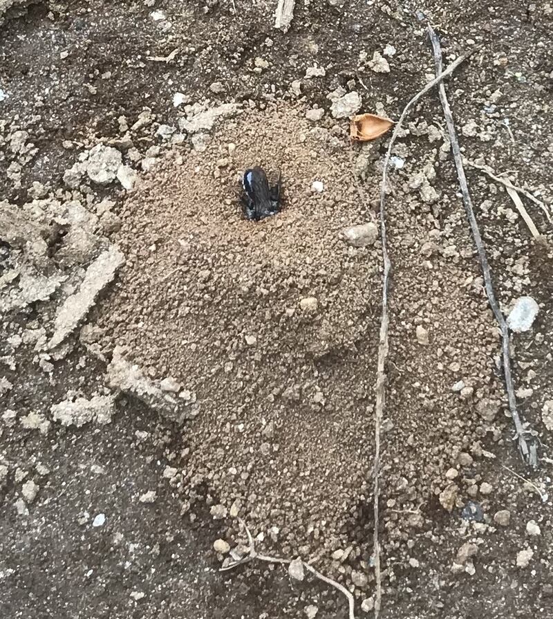 They are not flies and the nests are not ants’ nests. These tiny volcano-like structures are the entrances to the nests of mining bees. These are solitary bees, each with its own nest and young grub inside. They put pollen in for the grub to feed on and then close the entrance. As I only have its tail-end to go on, I think it is probably an ashy mining bee.