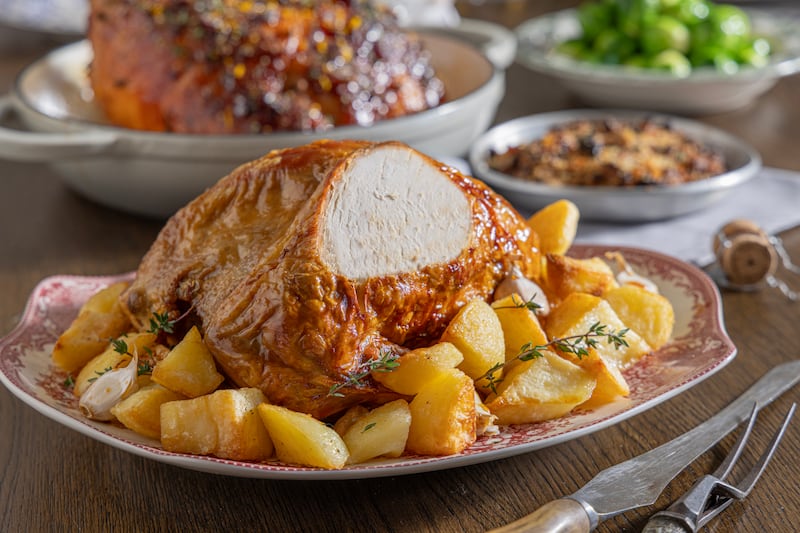The first recipe is for the ham. I find baking the ham always offers a better result than boiling. I buy it bone-in and skin-on to avoid moisture loss. It bakes for three hours before a good hour’s rest to soak up all the juices again. This opens up the oven for the turkey crown. I also have a trick for adding a syrupy thick glaze. No in and out of hot ovens, basting boiling sugar glazes and a tray that needs a date with a powerhose after. It is ready to carve and serve after applying the glaze. Soy, honey and orange is a delicious combo by the way.