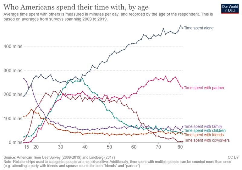 Time spent with friends peaks in the late teens and decreases fairly rapidly through the career-building, family-forming decades of 20s to 40s. The retirement decades bring a substantial increase in time spent with a partner, and a temporary slight uplift in the company of friends. But with children raised and co-workers likely to be out of the picture, time alone overshadows the rest.