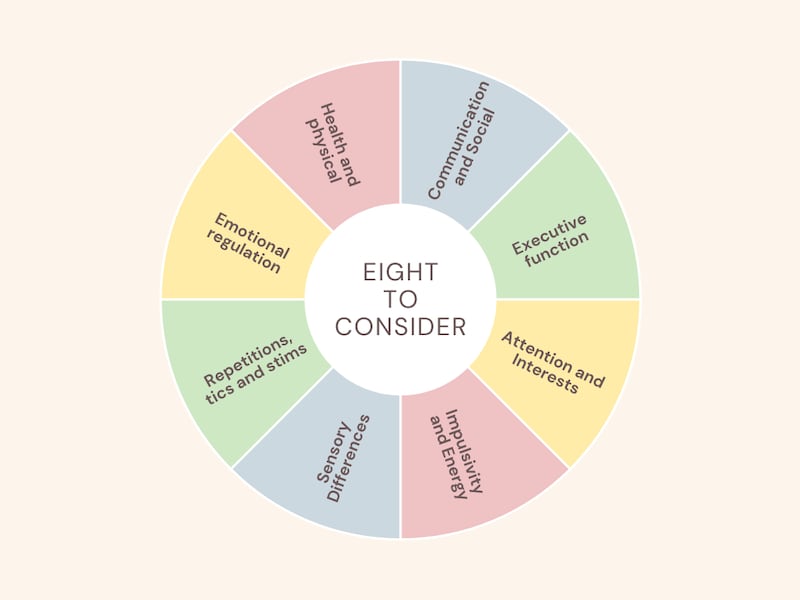 Getting a good picture of your child’s strengths and challenges is crucial to understanding and supporting them. Seeking multidisciplinary assessment from professionals such as OTs (occupational therapists), SLTs (speech and language therapists), psychologists and others can give you a broad picture of how your child manages across several domains. As a parent, you can also take time to consider your child’s strengths and needs in some different life areas.