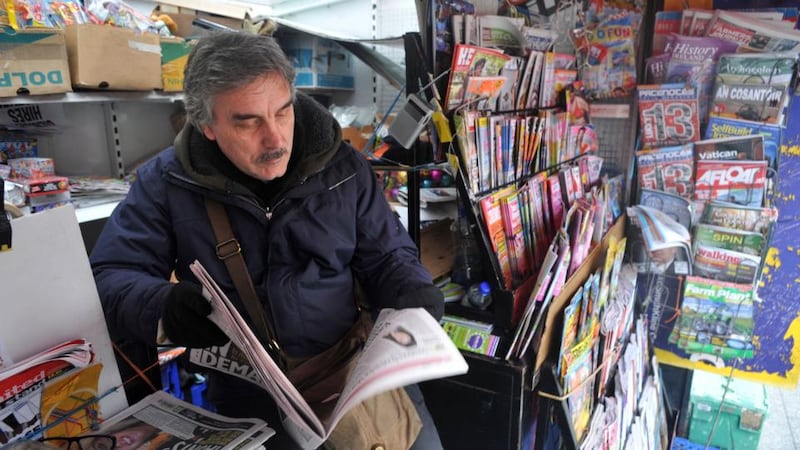The street is getting busy. Austin Cregan has worked the news stand at the junction of Abbey Street for 40 years. His late father had the stand before him, and his grandfather had it before that. “There were once 40 newspaper sellers on this street, selling from satchels and prams,” he says. “Now there are two.”