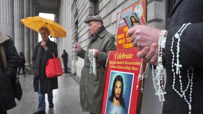 Beside the GPO John Moore, a retired accountant, is having an animated discussion with a man called Jim. Jim seems angry. Every Friday, Moore and his friend George Dalton come up from Laois to give out plastic rosary beads to passersby. John began doing this 20 years ago in Birmingham, when he gave up trying to get his daughters to go to Mass and decided to try his hand with strangers instead. On the other hand, Jim, a born-again Christian, believes praying to the Virgin Mary is idolatrous.