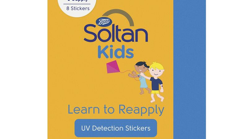 Soltan Kids Learn To Reapply UV Detection Stickers (€5 at boots.ie) are water- and sweat-resistant. Grab a wriggling child as they toddle or run by and attach the sticker to an exposed area like the upper arm. Slather said body in a tablespoon of sun cream, ensuring you apply over the sticker. After a minute of sunlight, the sticker will turn clear. When the sun cream has worn off, the sticker will go purple. It's not a guarantee of no sunburn – just a helpful visual reminder of when it's time to reapply.