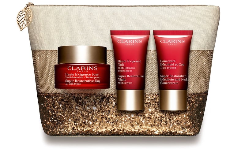 A skin hat trick – three of Clarins' cult re-plumping and face lifting lotions in golden clutch.