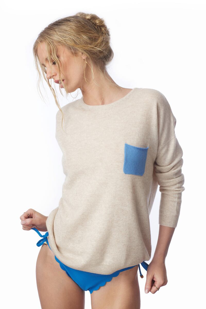 Her new collection was deliberately photographed with swimwear because cashmere, she says, is trans-seasonal and so light that “you take it with you on a sun holiday”. Colours are fresh and bright. A newly introduced waffle stitch lifts an otherwise plain sky blue, boxy, round-neck sweater. The collection now comprises 15 styles and some items such as plain vee- or round-neck sweaters and little cardigans come in fine merino.