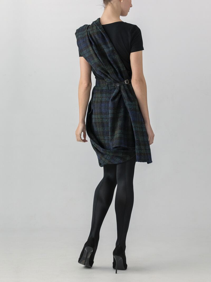 A brat has many meanings – it can refer to a badly-behaved child, or to a piece of Irish clothing worn in the Viking era under what was called a leine – a linen tunic. Now for the first time, the brat has undergone a very stylish reinterpretation by Banshee, the Irish-Italian duo based in Savile Row making pieces for modern women, notably in a dark tartan dress with a flamboyant cloak or brat attached.