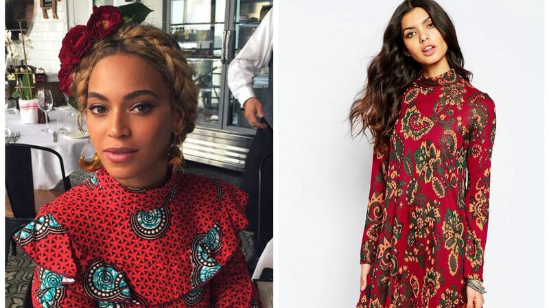 Beyoncé is a fan of Gucci and you can see why in this floral-print silk-georgette mini dress for €2000. Be your own fan in this vintage high neck mini-dress for €40.84 from asos.com