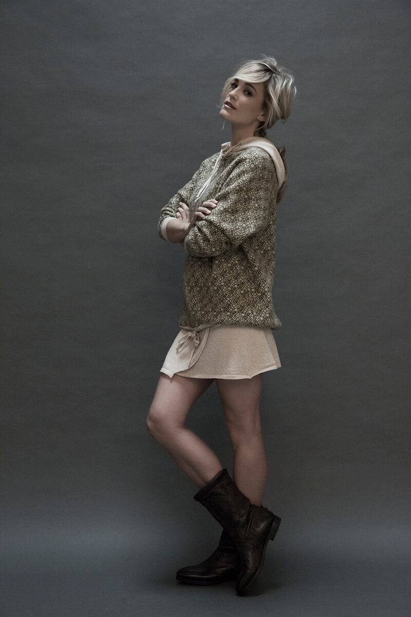 Ashe’s debut collection of 25 items is now complete and ready to show to buyers. It consists of wrap dresses, coats, skirts, cardigans, sweaters and accessories such as beanies, snoods and scarves. It is colourful, supersoft and well thought out. “There is something for every woman in there and shapes are evolving. You think of the lifestyle – people skiing, on yachts or wherever, and you think of mothers and daughters and you design with that in mind,” she explains.