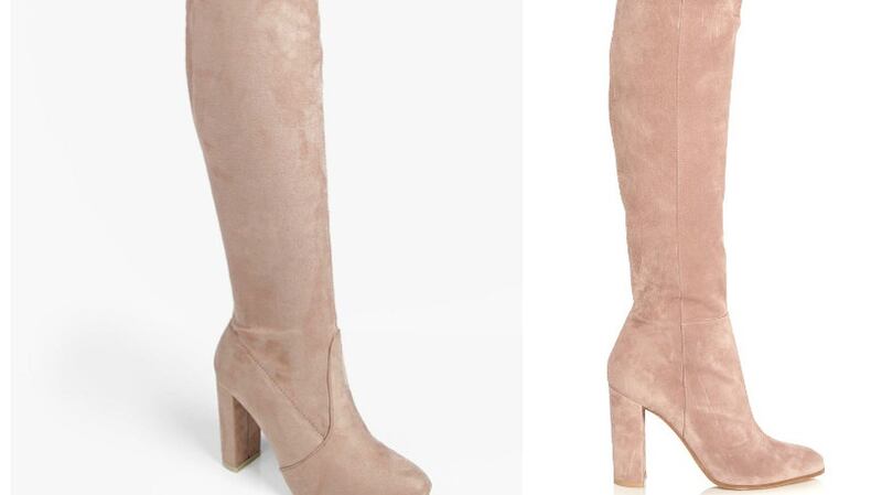 These suede over the knee boots for €1,595 from Gianvito Rossi (left) are not made for walking in puddles but neither are these Mia block heel lace-up boots (€54, right) from boohoo.com DMcM