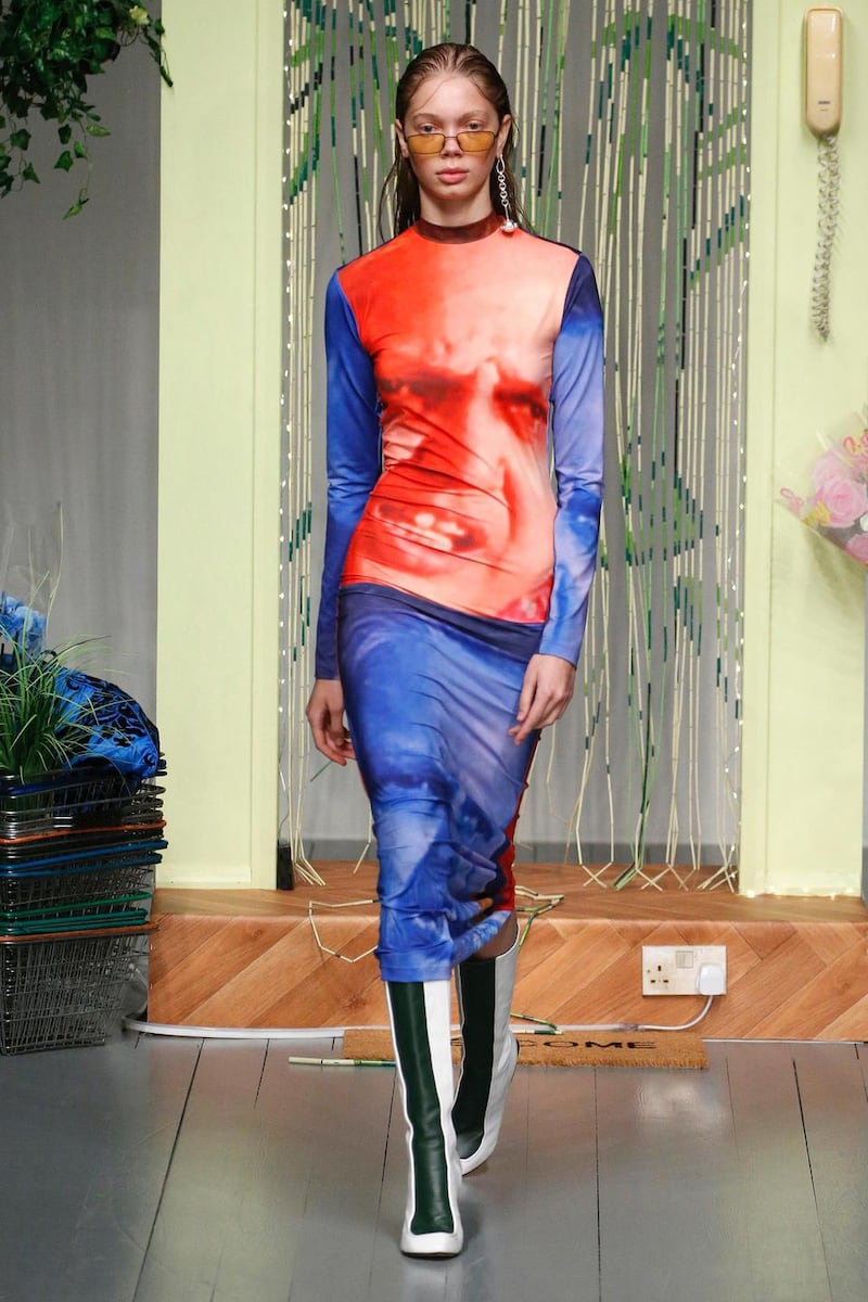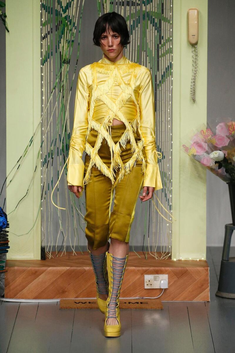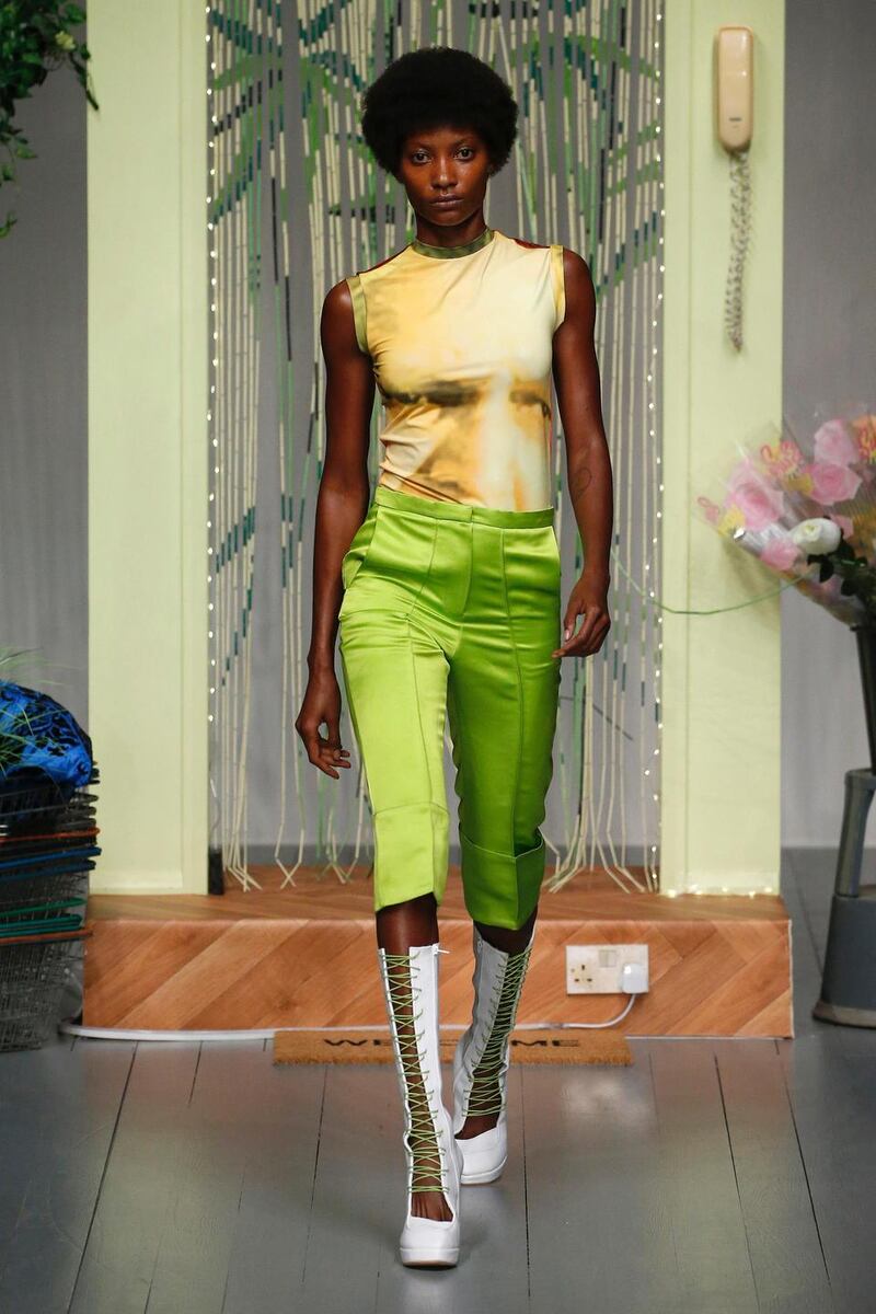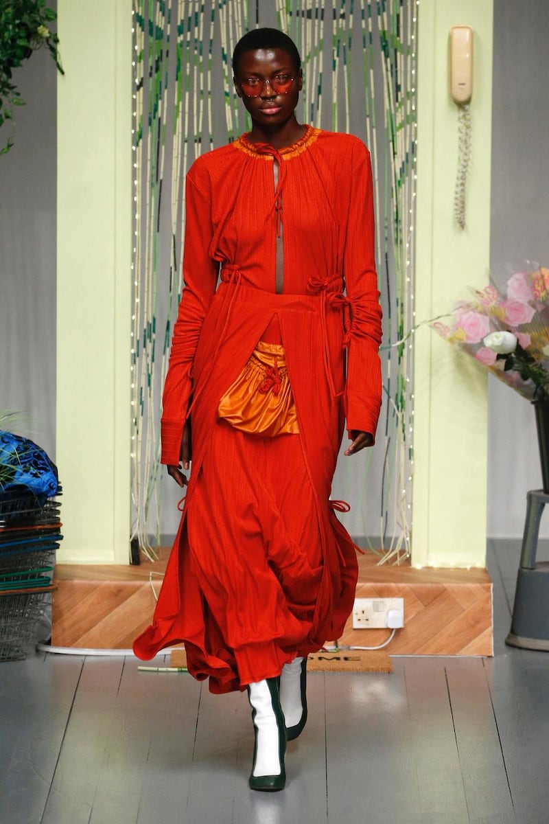 Malone, who will unveil a solo art exhibition in November, has used couture techniques for this collection, which featured lavish double-faced satin in vivid colours: sapphire, lime green, red, gold and pale blue for trouser suits with lightweight balloon-sleeved jackets. A fabric made from a reusable nylon composite provided softer lines for long fluid dresses laced, quilted, dip-dyed or ruched. Flying ribbons and turbo tassels fluttered on everything from dresses and tube skirts to biker trousers. Minidresses, some with prints abstracted from the visual diary that Malone keeps on his iPhone, were a first. White blocky lace-up boots, and bags made from recycled truck tarpaulins – further evidence of a steadfast commitment to sustainability – were also notable.
