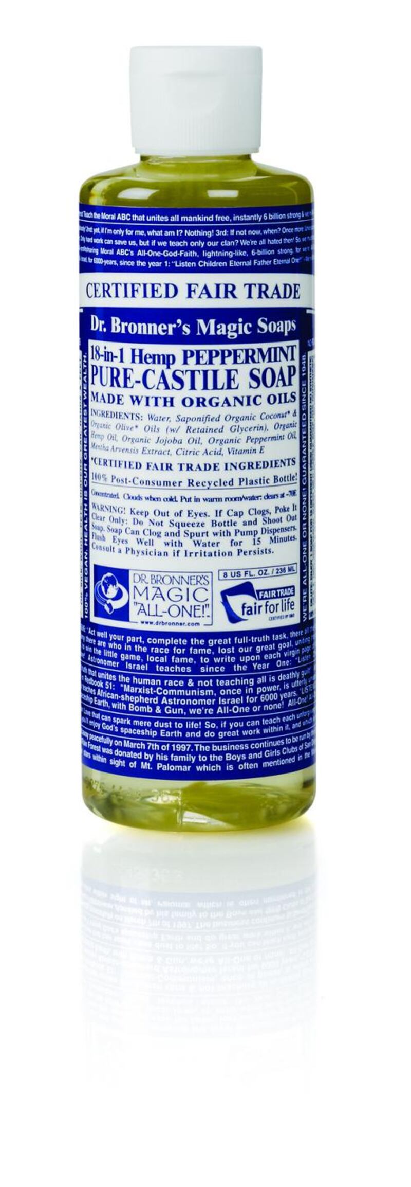 This liquid soap can be used to wash your face, body, hands and hair, to bath, shave, brush your teeth, rinse fruit, clean dishes, do laundry, wash windows, mop floors, scrub toilets, control dust mites, kill ants and aphids (garden pests), aromatherapy and even wash your dog. The company website (www.drbronner.com) provides diluting instructions for each.
