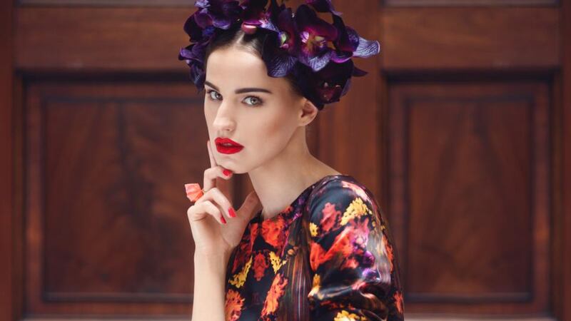 This dress from her current collection, photographed by Anita Sadowska, has a printed silk top and wool crepe skirt with bow, €355, worn with a purple orchid headpiece by florist Ann Marie O'Leary from Kerry (annmarieoleary.com) and ring by jeweller Angela O'Keefe (angelaokeefe.com) from Cork. See niamhoneill.com.