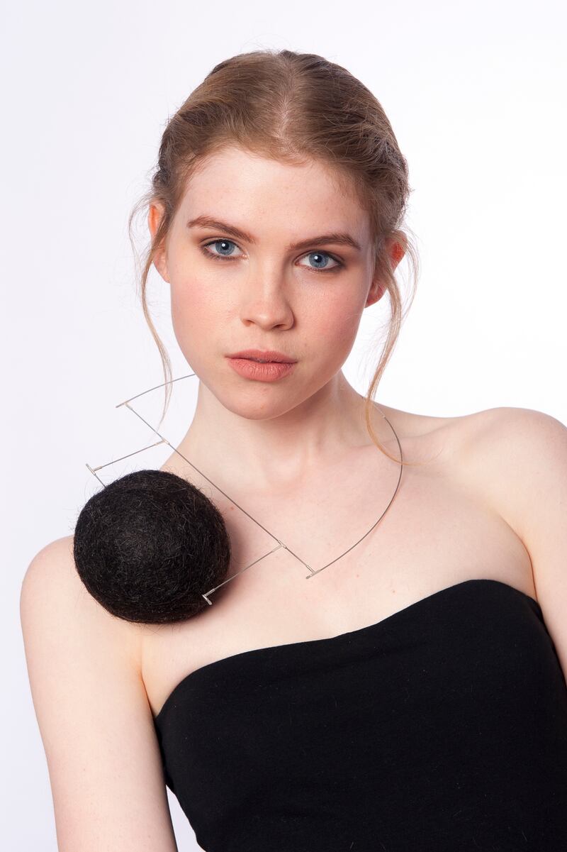 Rebecca Maddock following the vogue for using human hair, incorporated it into a felted ball for a modern neckpiece suspended on stainless steel wire.