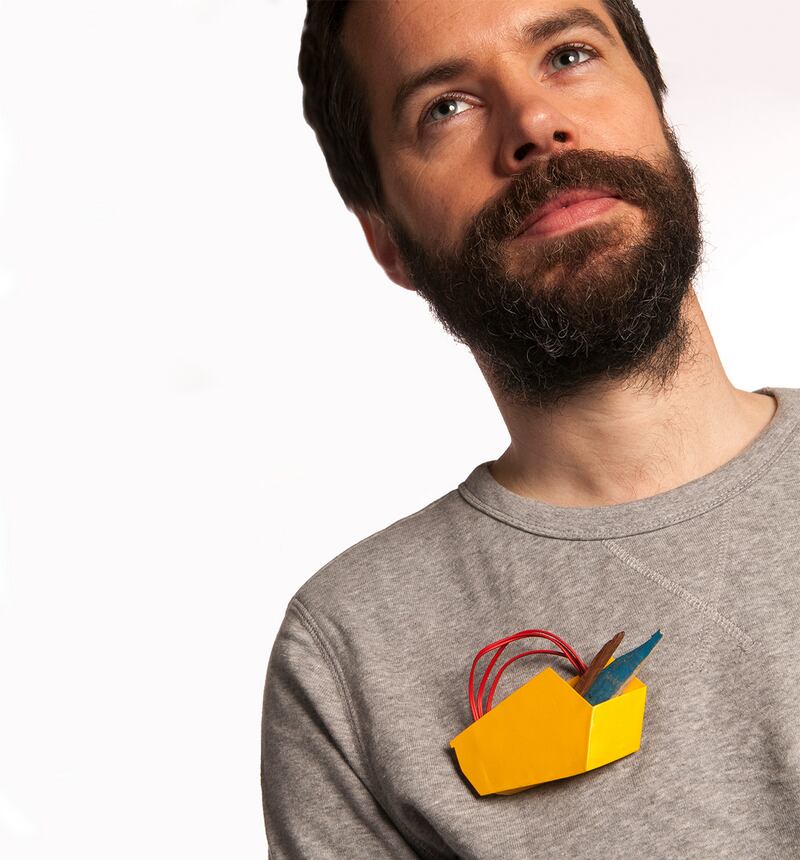 MFA graduate Jaki Coffey who uses her husband as a model for her interactive skip brooches takes a more humorous approach and loves the idea of recycling. Her brooches come with magnets back and front so the wearer can take pieces out and select other "pieces of rubbish" to put in.