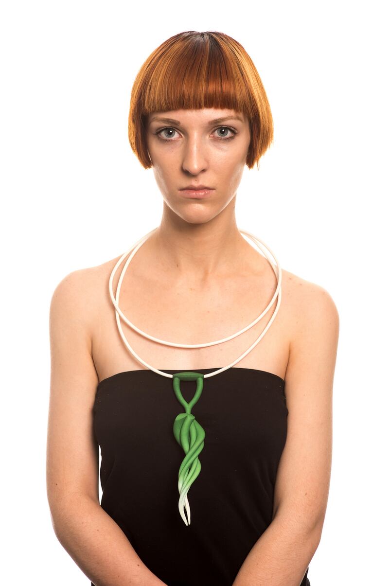 , an honours BA has mastered the mix of new technology and traditional craft skills with pieces that involve 3D printing and hand-dyeing all based on her mother’s garden and her tools like this “dibber” necklace and other pieces like a “hydrangea” neckpiece. She has just won an award from the British Association of Contemporary Jewellers in London.